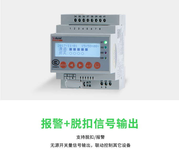 设备支持自定义报警阈值,漏电、温度参数可按需调试,内置完整事件记录,留存告警数据与故障日志,方便后期溯源排查。丰富的开关量输入、继电器输出接口,可无缝对接主流消防主机、电力监控平台,实现系统联动闭环防护。产品通过消防检测,抗电磁干扰能力强,适配复杂工业用电环境,兼顾新建工程标准化配置与老旧小区、城中村升级改造需求,一站式解决工程电气安全监控难题。