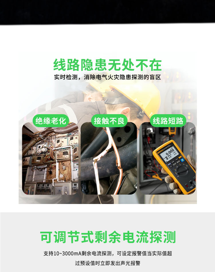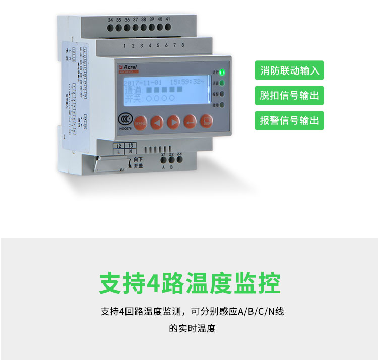 在监测精度上,产品搭载高灵敏零序互感器与 NTC 测温探头,微小漏电与缓慢升温均可精准识别,弥补普通保护器无法预警隐性隐患的短板,从源头防范电弧火灾风险。一体化集成设计,单台设备整合采集、显示、报警、通讯、联动多重功能,减少外设数量,简化配电柜内部布线,提升系统稳定性。